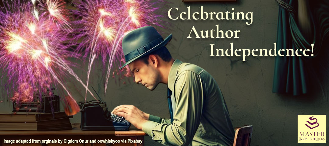 featured image of author typing and fireworks launching from the page for blog post, 'Celebrating Author Independence,' by Tom Collins